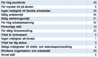 Andra skäl som angavs som viktiga var brist på flexibla arbetstider och för hög jourbörda.
